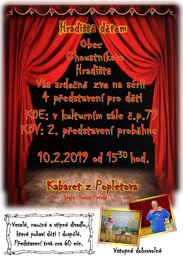 Obec Choustníkovo Hradiště Vás srdečně zve na divadelní představení Kabaret z Popletova. Veselé, naučné a vtipné divadlo, které pobaví děti i dospělé. Představení trvá cca 60 minut. Účinkuje Honza Petráš. Vstupné dobrovolné.
