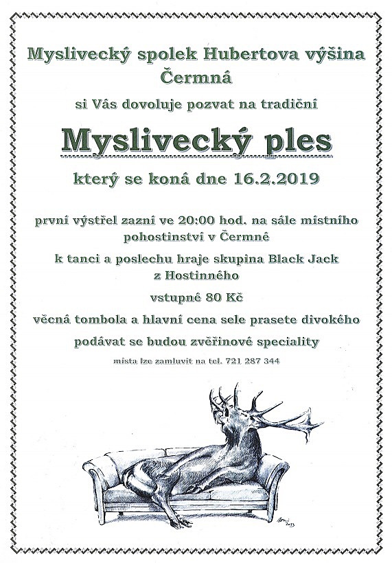 Myslivecký spolek Hubertova výšina Čermná si Vás dovoluje pozvat na tradiční Myslivecký ples, který se koná v sobotu 16. 2. 2019. Začátek ve 20:00 hodin na sále místního pohostinství v Čermné. Vstupné 80 Kč. Více informací na plakátě.