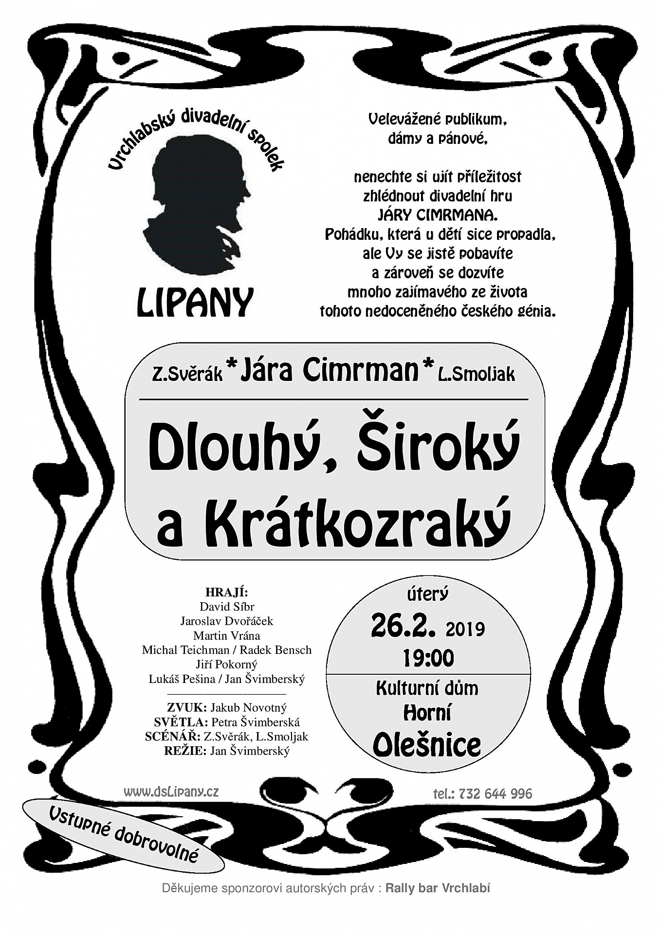 Velevážené publikum, dámy a pánové, nenechte si ujít příležitost zhlédnout divadelní hru Járy Cimrmana. Pohádku, která u dětí sice propadla, ale Vy se jistě pobavíte a zároveň se dozvíte mnoho zajímavého ze života tohoto nedoceněného českého génia. Hru představí Vrchlabský divadelní spolek v úterý 26. února 2019 od 19 hodin v kulturním domě v Horní Olešnici. Více informací najdete na plakátu.