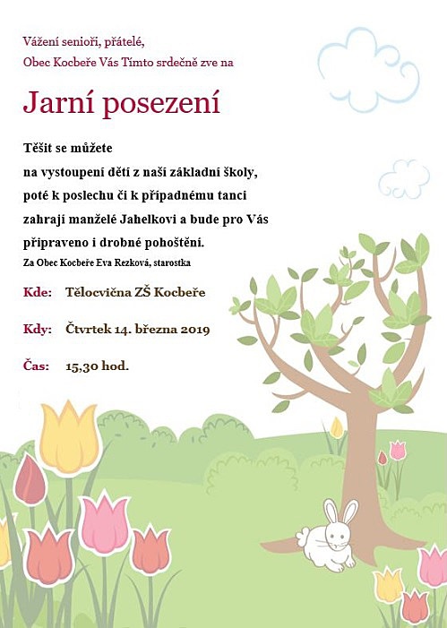 Obec Kocbeře Vás tímto srdečně zve na Jarní posezení. Těšit se můžete na vystoupení dětí ze ZŠ, poté k tanci a poslechu zahrají manželé Jahelkovi. Bude pro Vás připraveno drobné pohoštění. Za obec Kocbeře Eva Rezková