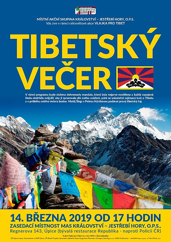 V březnu roku 2019 uplyne již šedesát let od vypuknutí Tibetského národního povstání. Touto celosvětovou akcí si každoročně připomínáme okupaci Tibetu Čínou. A přestože v některých městech v Česku budou opět vlát tibetské vlajky, nebude to rozhodně na oslavu, ale na podporu vyjádření solidarity s malým okupovaným státem. Také jako každoročně se MAS KJH, o.p.s. připojila k této akci; a krom nás i ZŠ Úpice - Lány, Gymnázium a SOŠ Úpice, ZŠ Bratří Čapků, Speciální základní škola Augustina Bartoše, Orange Catering a Tisk Ofset, a.s. Tentokrát jsme naplánovali tibetský večer na čtvrtek 14. března 2019. Budeme se těšit na Vaši návštěvu a Vy se můžete těšit na podvečer plný Tibetu, a to konkrétně tibetských mandal, kvízu o Tibetu a pravého tibetského čaje!