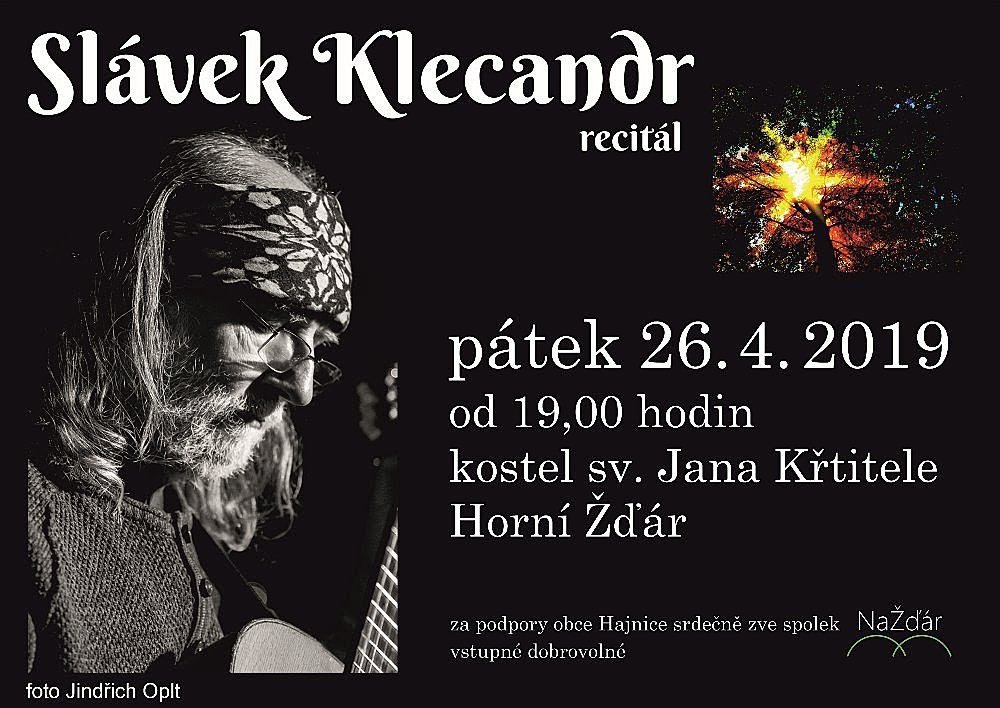 Spolek NaŽďár za podpory obce Hajnice vás srdečně zvou na akci Slávek Klecandr recitál, který se koná v pátek 26. dubna 2019 v kostele sv. Jana Křtitele v Horním Žďáru. Vstupné dobrovolné.