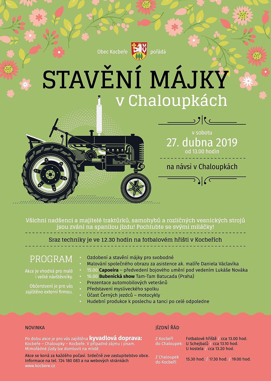 Obec Kocbeře pořádá Stavění májky v Chaloupkách, které se koná v sobotu 27. dubna 2019 od 13:00 hodin. Součástí programu bude spanilá jízda traktůrků, samohybů a rozličných vesnických strojů. Těšit se můžete na stavění májky pro svobodné, malování společného obrazu, ukázku bojového umění, bubenickou show, prezentaci automobilových veteránů a mnoho dalšího. Občerstvení i hudební produkce jsou zajištěny.