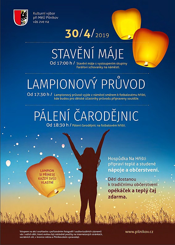 Město Pilníkov vás zve 30. dubna 2019 na podvečer plný zábavy. Od 17:00 hodin to bude stavění máje s vystoupení skupiny Farářovi schovanky na náměstí. V 17:30 vyjde z náměstí lampionový průvod směrem k fotbalovému hřišti, kde se od 18:30 koná pálení čarodějnic. Těšíme se na vás!