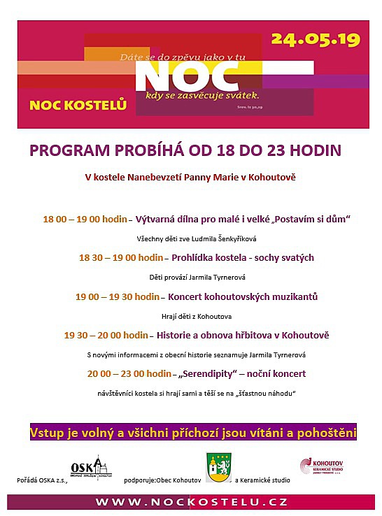 Kohoutovský spolek Oska z.s. vás srdečně zve na akci s názvem Noc kostelů, která se koná v místním kostele Nanebevzetí Panny Marie v pátek 24. 5. 2019 od 18:00 do 23:00 hodin. Program a vše, na co se můžete těšit najdete na plakátu. Vstup je volný a všichni příchozí jsou vítání a pohoštěni.
