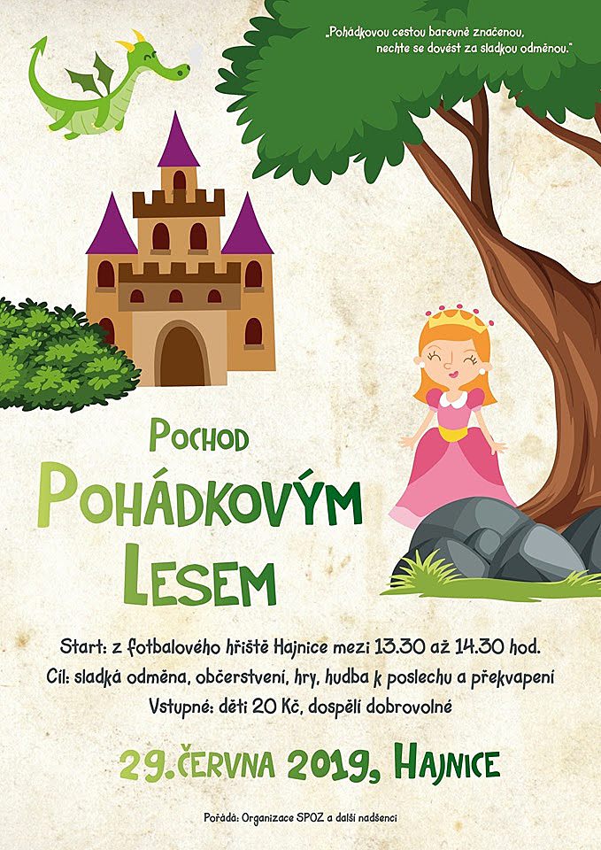 Srdečně Vás zveme na Pochod pohádkovým lesem a to v sobotu 29. června 2019. Zavítejte do Hajnice vesele otevřít dětské letní prázdniny. Přijďte s dětmi nebo i sami na příjemnou procházku plnou hravé pohádkové představivosti. Těší se na Vás parta nadšenců pod vedením organizace SPOZ. Více informací na plakátě.