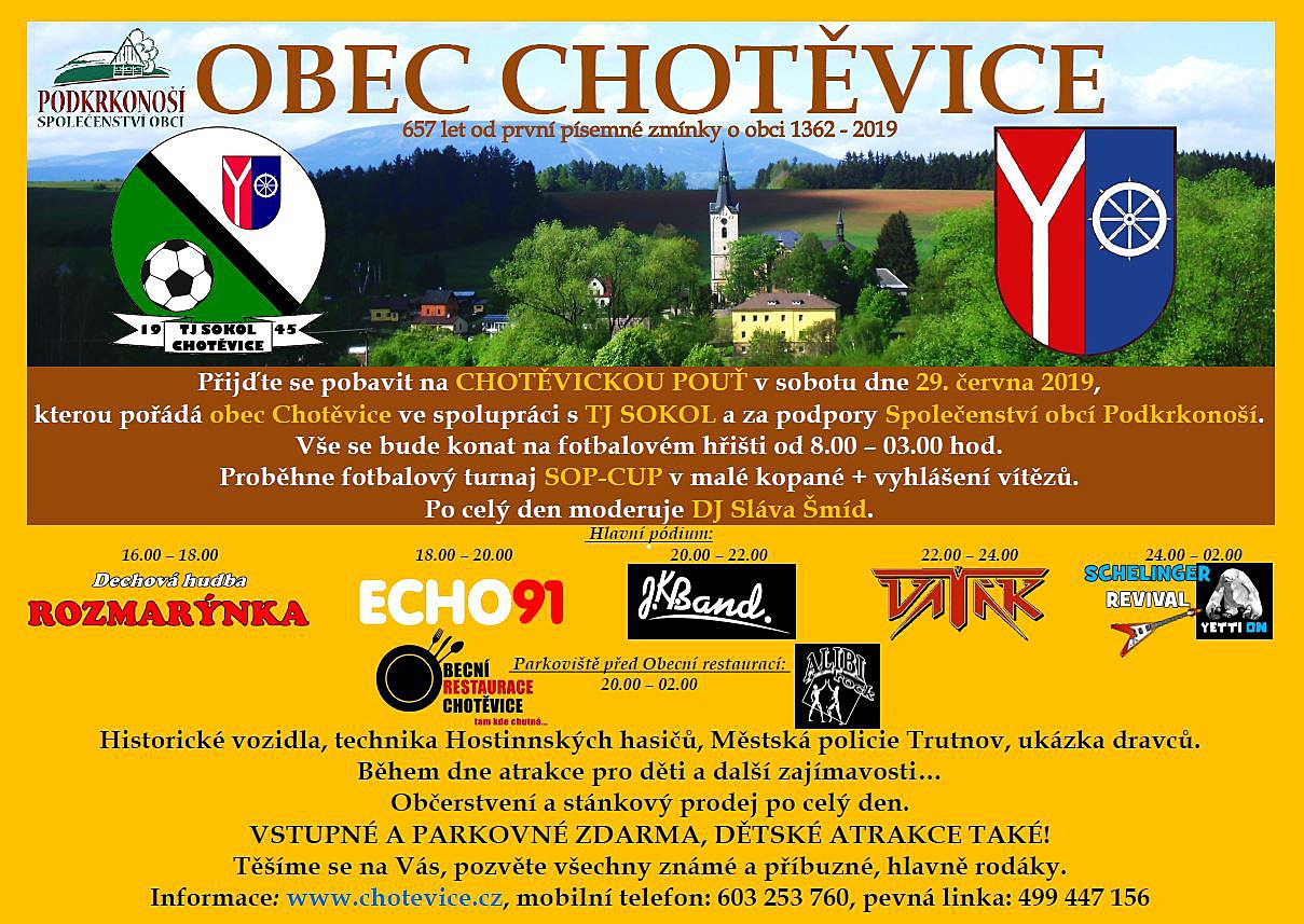 Obec Chotěvice ve spolupráci s TJ Sokol Chotěvice a za podpory Společenství obcí Podkrkonoší pořádá Chotěvickou pouť. Vše se bude konat na fotbalovém hřišti, kde zároveň proběhne fotbalový turnaj SOP CUP v malé kopané. Vstupné, parkovné a dětské atrakce zdarma! Více informací na plakátě. Těšíme se na Vás!