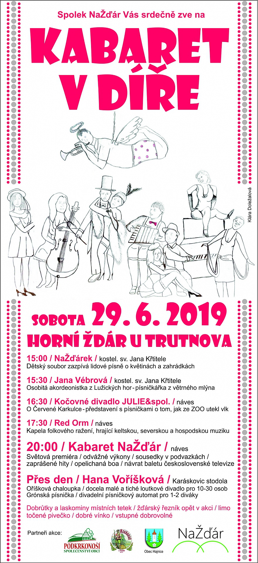 Spolek NaŽďár Vás srdečně zve na akci v Horním Žďáru u Trutnova, která proběhne v sobotu 29. 6. 2019 a začne v 15:00 hodin koncertem dětského sborečku NaŽďárek a akordeonistky Jany Vébrové v kostele sv. Jana Křtitele. Program vyvrcholí ve 20:00 hodin světovou premiérou představení Kabaretu NaŽďár. Nenechte si ujít! Občerstvení zajištěno, vstupné dobrovolné. Více na plakátu.