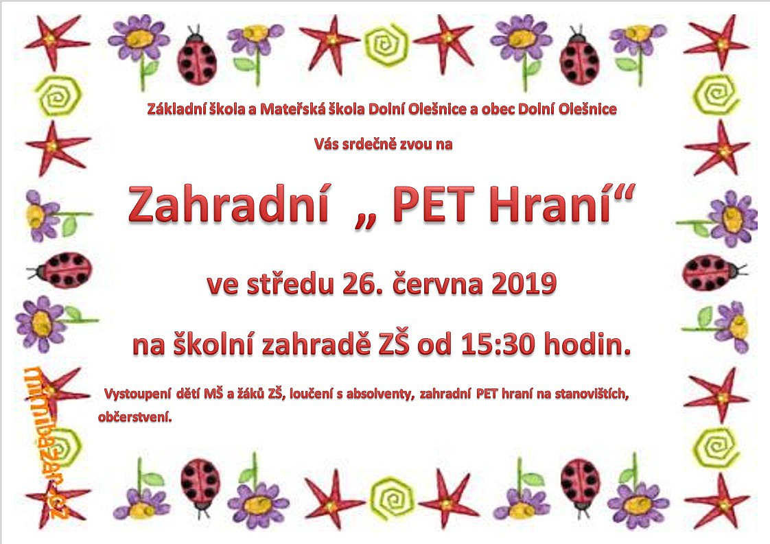 Základní škola a Mateřská škola Dolní Olešnice a obec Dolní Olešnice Vás srdečně zvou na Zahradní "PET Hraní" ve středu 26. června 2019 na školní zahradě ZŠ od 15:30 hodin.