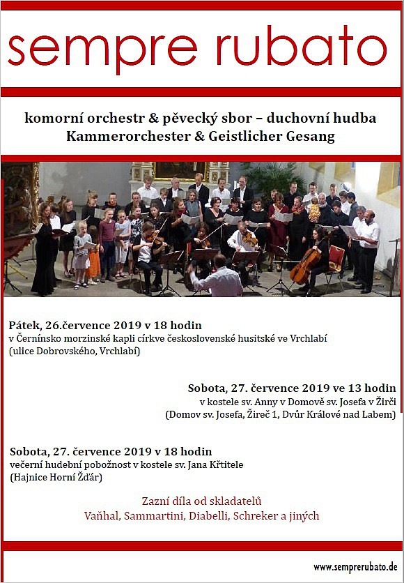 Jste srdečně zváni na koncert duchovní hudby komorního orchestru a pěveckého sboru Sempre rubato (Německo), který vystoupí mj. v kostele sv. Jana Křtitele v Horním Žďáru. Akce se koná v sobotu 27. 7. 2019 od 18:00 hodin. Více informací na plakátu.