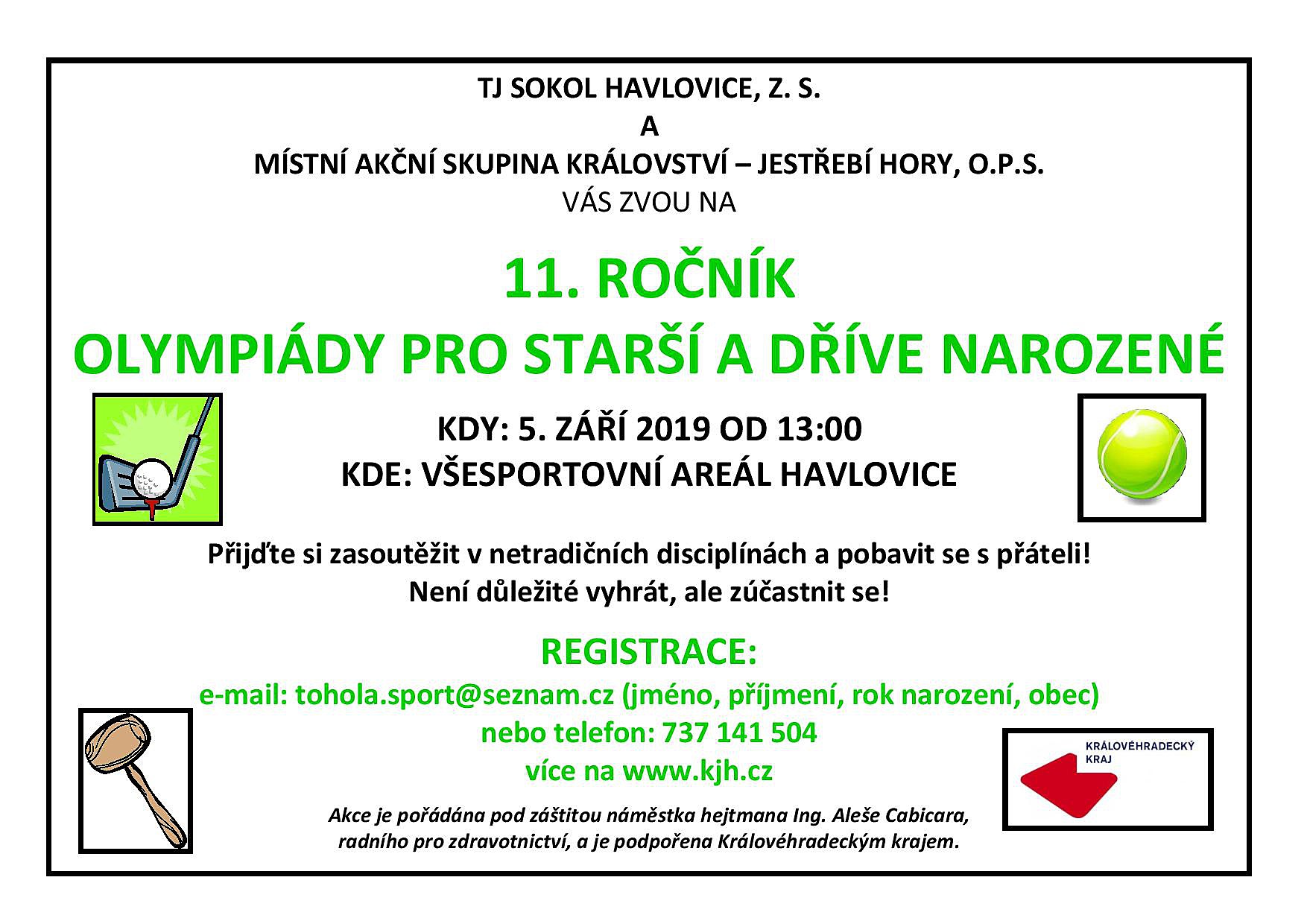 Rádi bychom Vás pozvali na již jedenáctý ročník Olympiády pro starší a dříve narozené. Tak jako každý rok se olympiáda bude konat ve Všesportovním areálu v Havlovicích a to 5. září 2019 od 13:00 hodin. Akci v letošním roce finančně podpořil opět i Královehradecký kraj. Pro účastníky olympiády z území Místní akční skupiny Království – Jestřebí hory, o. p. s. nabízíme možnost svozu i odvozu autobusy zdarma. Senioři s rokem narození 1954 a starší ať se předem registrují u pana Miloslava Toholy (TJ Sokol Havlovice, z. s.) na mailu tohola.sport@seznam.cz (jméno, příjmení, rok narození a obec) nebo na telefonu 737 141 504 a to do 23. 8. 2019. Pokud se nestihnete zaregistrovat i přesto Vás rádi přivítáme. Více informací ve zvacím dopise a na plakátu.