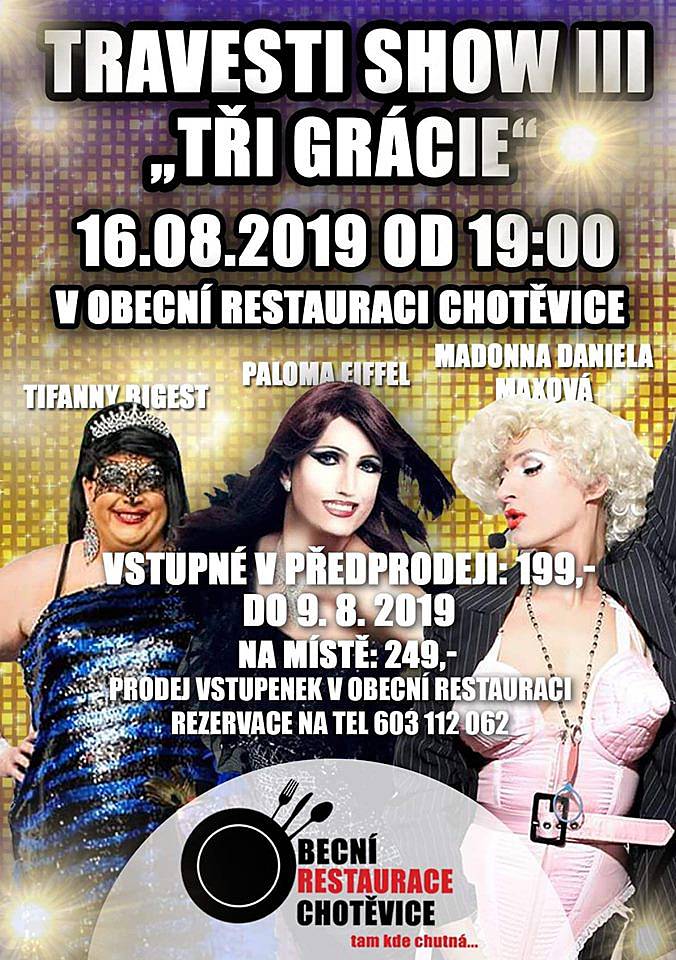 Srdečně vás zveme do obecní restaurace Chotěvice, kde v pátek 16. 8. 2019 vystoupí travesti trio Tři grácie. Předprodej vstupenek v obecní restauraci za 199 Kč do 9. 8. 2019, na místě pak vstupné 249 Kč. Více informací na plakátu.