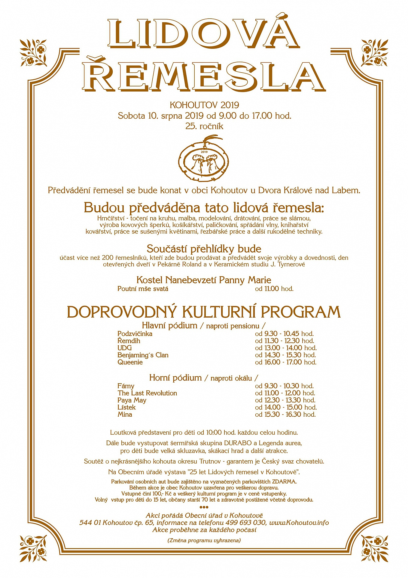 Lidová řemesla v Kohoutově, akce, která se těší velké oblibě a je hojně navštěvována, vás letos přivítá již na svém 25. ročníku. Akce se koná v sobotu 10. 8. 2019 od 9:00 do 17:00 hodin. Těšit se můžete na hrnčíře, kováře, šperkaře, dráteníky a mnohé další šikovné ruce, které předvedou řemesla se svým jedinečným kouzlem. Parkování zajištěno na vyznačených parkovištích zdarma. Vstupné 100 Kč, děti do 15 let a občané nad 70 let mají vstup zdarma. Podrobné informace naleznete na plakátu.