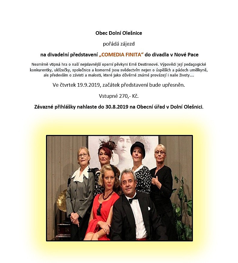 Obec Dolní Olešnice pořádá ve čtvrtek 19. 9. 2019 zájezd na divadelní představení "COMEDIA FINITA" do Nové Paky. Bližší info na plakátě.