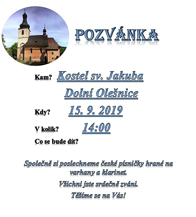 Srdečně vás zveme na společné setkání s Kristýnkou Kalenskou (varhany a zpěv) a Klárkou Svrčkovou (klarinet) do kostela sv. Jakuba v Dolní Olešnici v neděli 15. září 2019 ve 14:00 hodin. Příjďte si poslechnout české písničky.