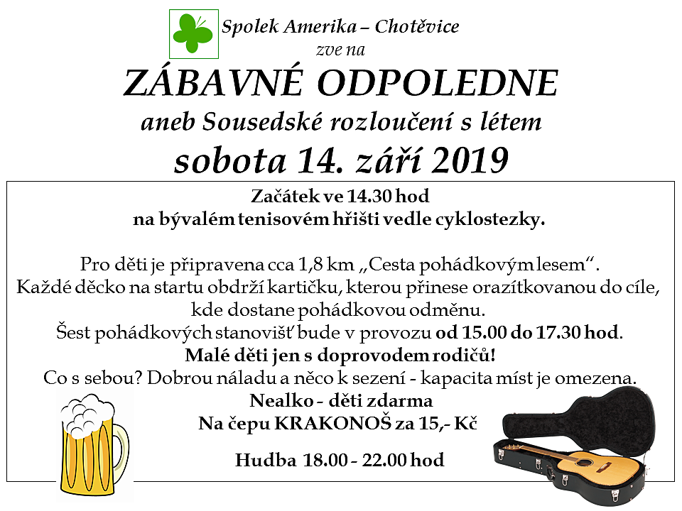Spolek Amerika - Chotěvice Vás zve na Zábavné odpoledne aneb Sousedské rozloučení s létem. Akce se koná v sobotu 14. září 2019 od 14:30 hodin na bývalém tenisovém hřišti vedle cyklostezky. Pro děti je připravena Cesta pohádkovým lesem. Více informací na plakátě.