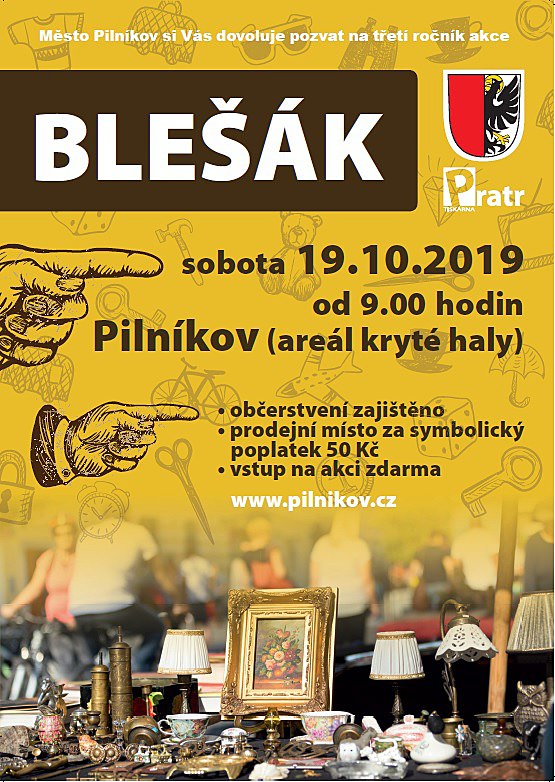 Již třetí ročník akce Blešák se koná v Pilníkově v sobotu 19. říjnu 2019 od 9:00 hodin v areálu kryté haly. Občerstvení je zajištěno, prodejní místo za symbolický poplatek 50 Kč. Vstup na akci je zdarma.