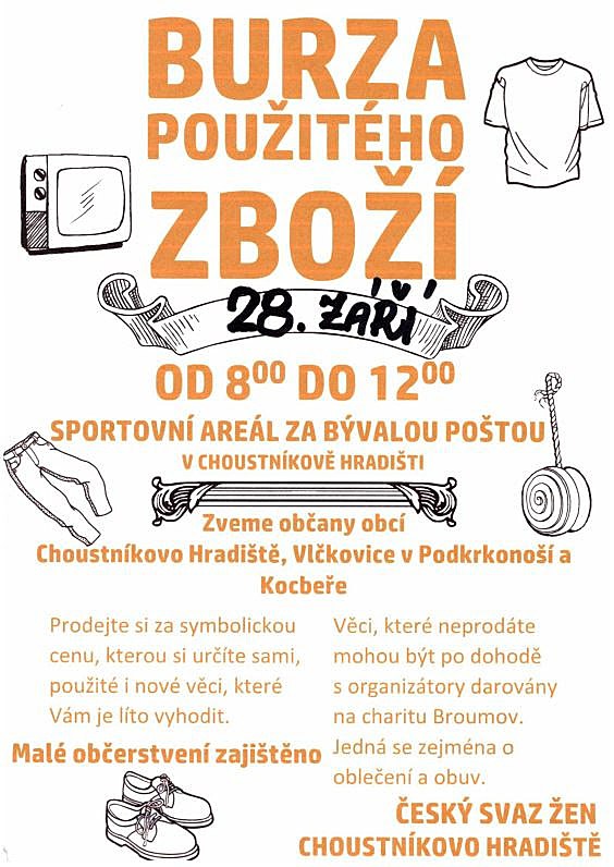 Zveme občany obcí Choustníkovo Hradiště, Vlčkovice v Podkrkonoší a Kocbeře na burzu použitého zboží, která se koná v sobotu 28. září 2019 od 8:00 do 12:00 hodin ve sportovním areálu za bývalou poštou. Další informace jsou uvedeny na plakátě.