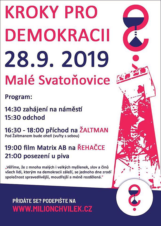 V sobotu 28. 9. 2019 se na náměstí Karla Čapka v Malých Svatoňovicích v rámci kampaně Milion chvilek pro demokracii koná akce Kroky pro demokracii. Začátek je ve 14:30, v 15:30 pak účastníci společně vyrazí k Žaltmanu, kde se budou opékat vuřty. Program bude pokračovat na Řehačce promítáním filmu Matrix AB, od 21:00 hodin je připraveno posezení u piva. Více informací na milionchvilek.cz.