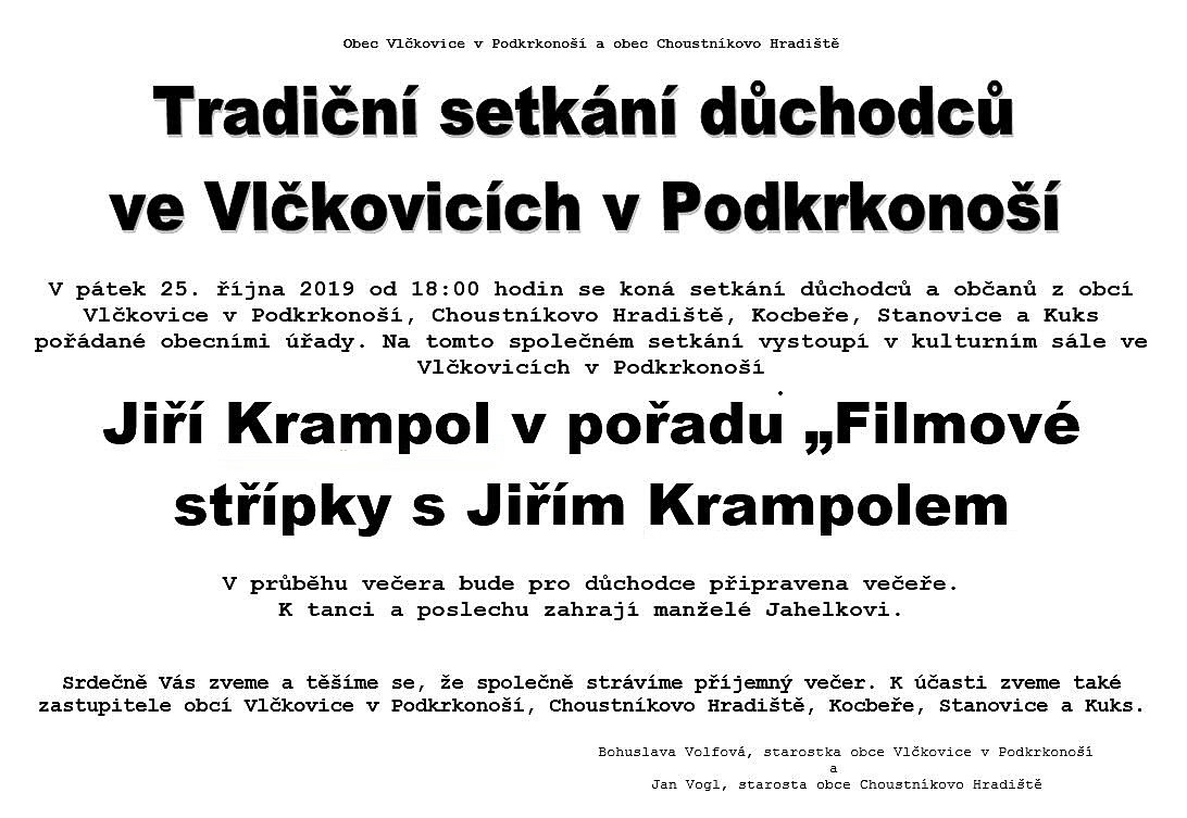 V pátek 25. října 2019 od 18:00 hodin se koná setkání důchodců a občanů z obcí Vlčkovice v Podkrkonoší, Choustníkovo Hradiště, Kocbeře, Stanovice a Kuks pořádané obecními úřady. Na tomto společném setkání vystoupí v kulturním sále ve Vlčkovicích v Podkrkonoší Jiří Krampol v pořadu Filmové střípky. Více informací naleznete na plakátě.