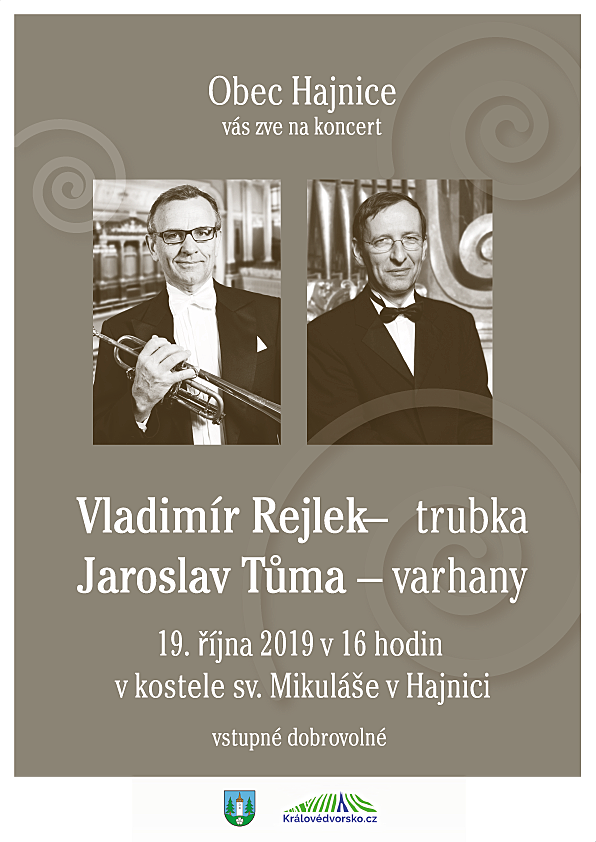 Obec Hajnice vás zve na koncert: Vladimír Rejlek - trubka, Jaroslav Tůma - varhany. Kostel sv. Mikuláše v Hajnici, sobota 19. 10. 2019 od 16:00 hodin. Vstupné dobrovolné.
