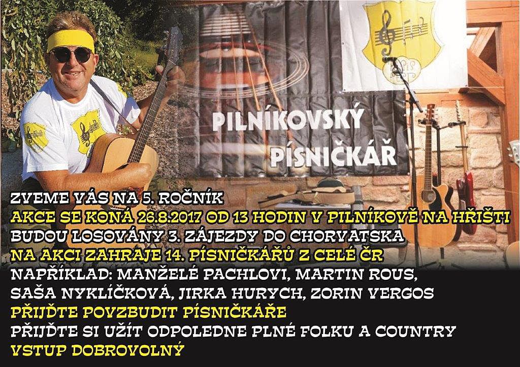 V Pilníkově na hřišti se v sobotu 26. srpna koná další ročník oblíbené hudební akce s názvem Pilníkovský písničkář. Začátek je od 13 hodin. Během odpoledne zahraje 14 písničkářů z celé ČR. Součástí akce je losování o tři zájezdy do Chorvatska.