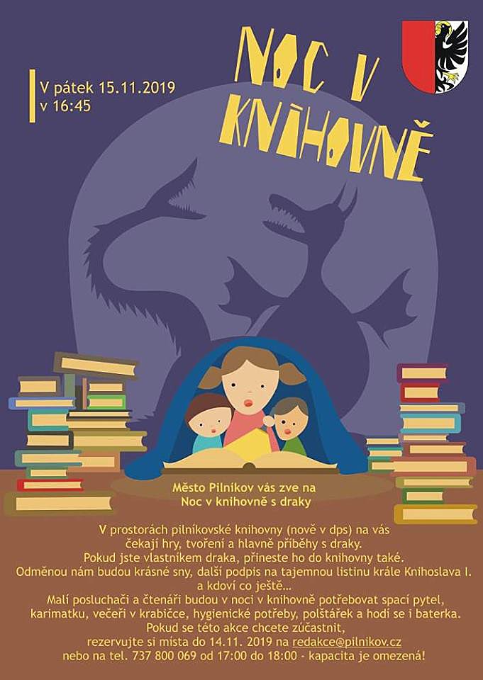 Město Pilníkov zve malé čtenáře na Noc v knihovně s draky. Čekají vás hry, tvoření a hlavně příběhy s draky. Pokud máte nějakého doma, přineste ho s sebou. Odměnou nám budou krásné sny, podpis na tajemnou listinu krále Knihoslava I. a možná i něco víc... Co dalšího s sebou a kde si rezervovat místo, se dočtete na plakátu.