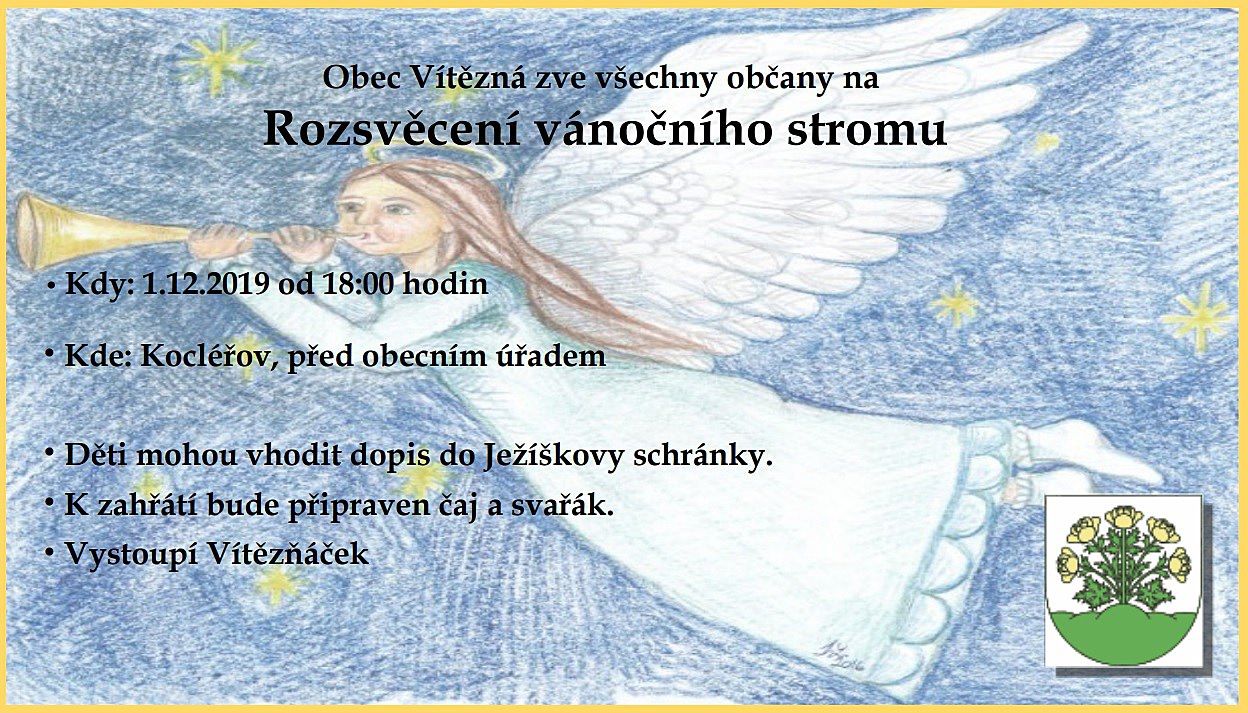 Obec Vítězná Vás tímto zve na již tradiční akci o první adventní neděli, tedy 1. 12. 2019, kdy se před obecním úřadem rozsvítí vánoční strom. Akce začíná v 18:00 hodin. Vánoční koledy zazpívá Vítězňáček a zahřát se budete moci teplým svařákem nebo čajem.