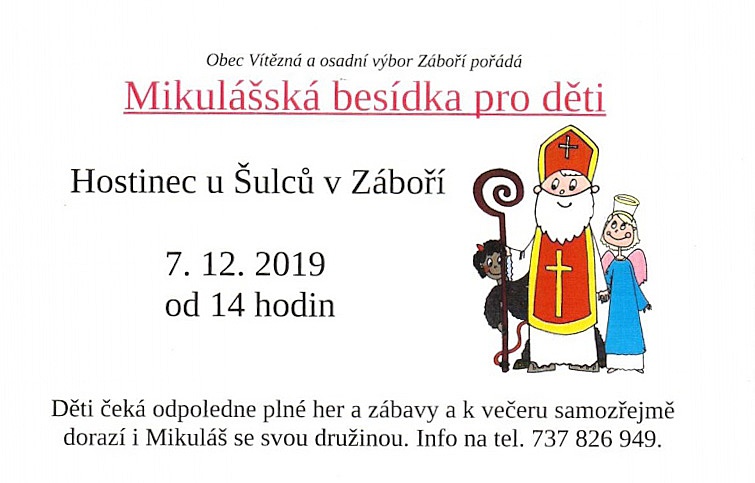 Obec Vítězná a osadní výbor Záboří pořádá Mikulášskou besídku pro děti. Besídka se koná v sobotu 7. 12. 2019 od 14:00 hodin v hostinci U Šulců v Záboří. Děti čeká odpoledne plné her a zábavy a k večeru samozřejmě dorazí i Mikuláš se svou družinou. Více informací na telefonu 737 826 949.