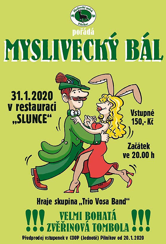 Myslivecký spolek Pilníkov pořádá v pátek 31.ledna na sále restaurace Slunce Myslivecký bál. Začátek je ve 20:00 hodin, vstupné 150,-Kč a k tanci hraje Trio Vosa Band. Vstupenky budou v předprodeji od 20.1.2020 v prodejně COOP Pilníkov.