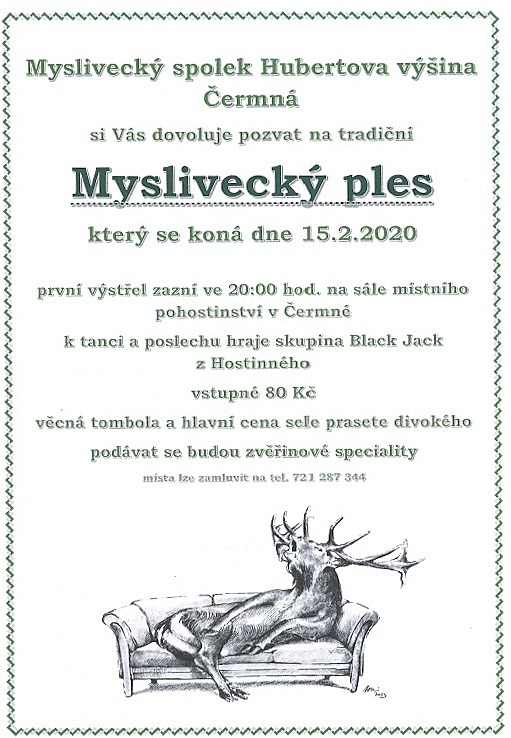 Myslivecký spolek Hubertova výšina Čermná si Vás dovoluje pozvat na tradiční myslivecký ples, který se koná v sobotu 15. 2. 2020 od 20:00 hodin na sále místního pohostinství v Čermné.