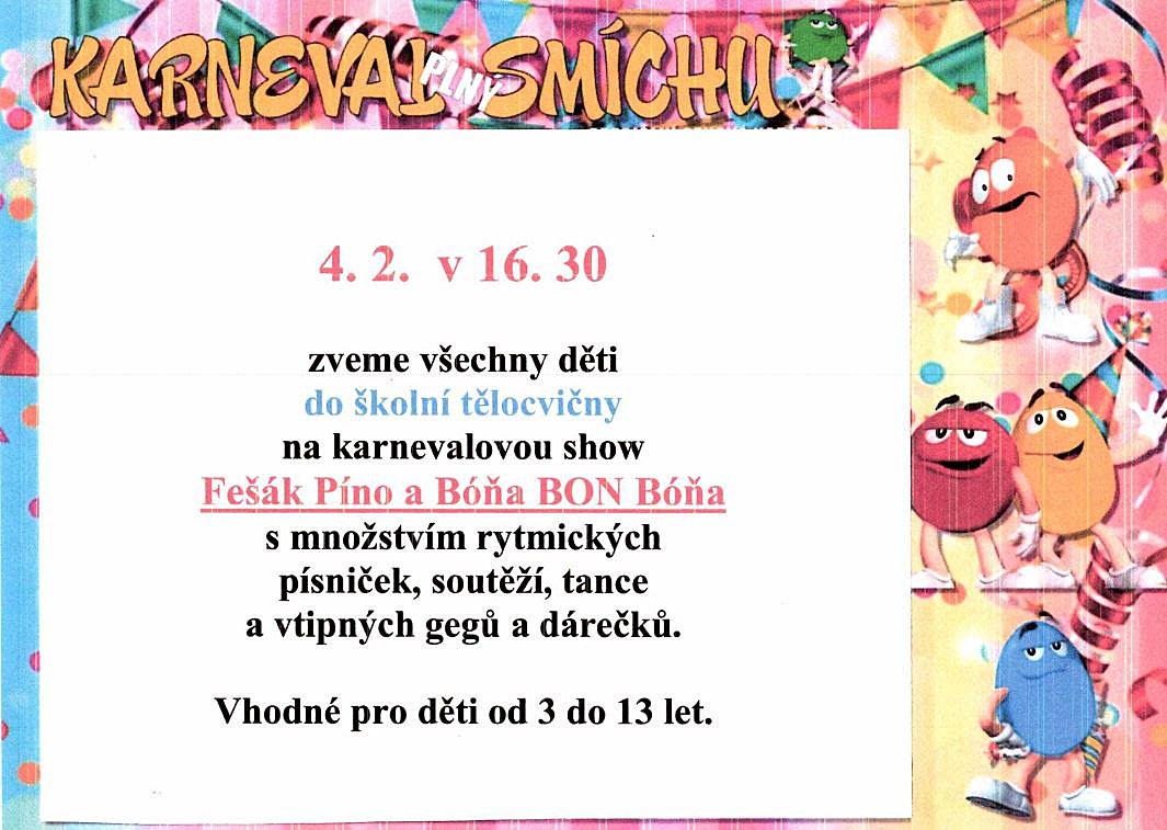 Obec Kocbeře zve všechny děti do školní telocvičny na karnevalovou show "Fešák Píno a Bóňa BON Bóňa" s množstvím rytmických písniček, soutěží a další zábavy. Vhodné pro děti od 3 do 13 let.