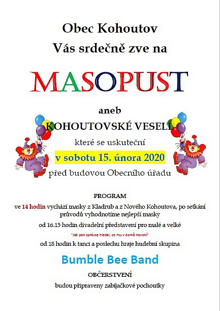 Obec Kohoutov Vás srdečně zve na Masopust aneb Kohoutovské veselí, které se uskuteční v sobotu 15. 2. 2020 před budovou Obecního úřadu. Více informací a program akce naleznete na plakátě.