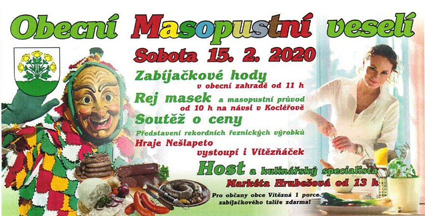 Obec Vítězná Vás srdečně zve na Masopustní veselí s bohatým programem, které se koná v sobotu 15. 2. 2020 od 11:00 hodin. Bližší informace o programu naleznete na plakátě.