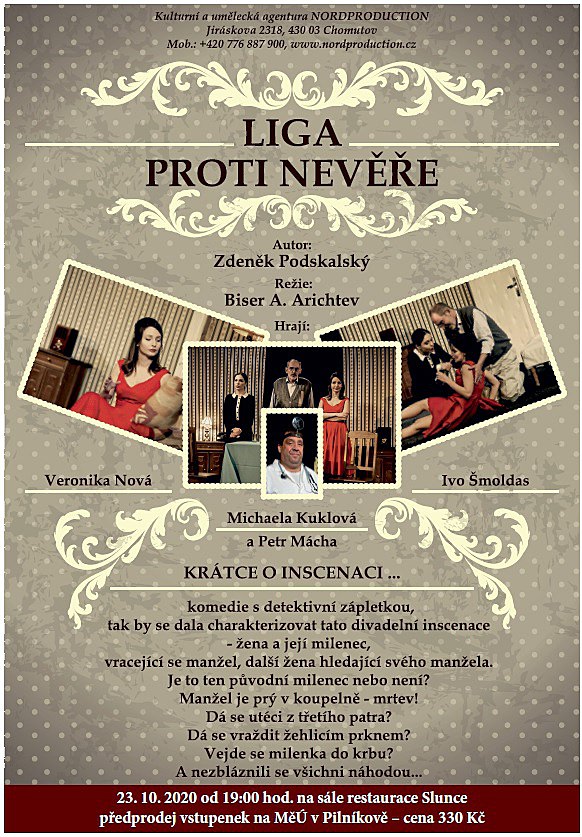 Jedná se o komedii s detektivní zápletkou, která bude sehrána od 19:00 hodin na sále restaurace Slunce. Vstupenky na toto představení v hodnotě 330,-Kč je možné zakoupit na MěÚ v Pilníkově, těšit se můžete na Ivo Šmoldase, Michaelu Kuklovou a Veroniku Novou.