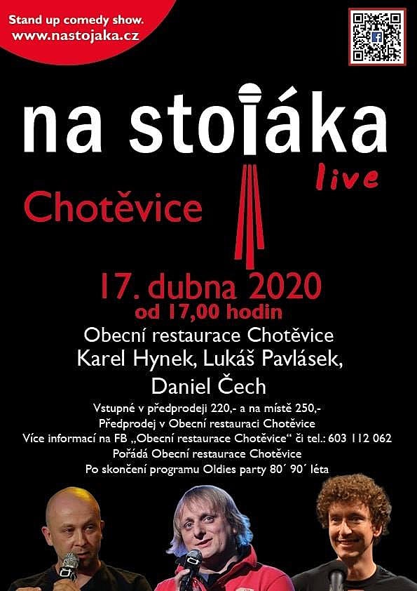 Určitě jste již slyšeli, že do Chotěvic dorazí pořád NA STOJÁKA. Představení od 20:00 hodin je beznadějně vyprodané! Proto jsme přidali odpolední představení od 17:00 hodin, které též má omezenou kapacitu. Vstupenky si můžete zakoupit u obsluhy v Obecní restauraci Chotěvice.