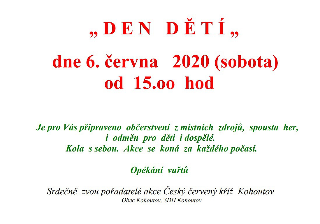 V sobotu 6. června se v Kohoutově koná Den dětí. Další informace na plakátě.