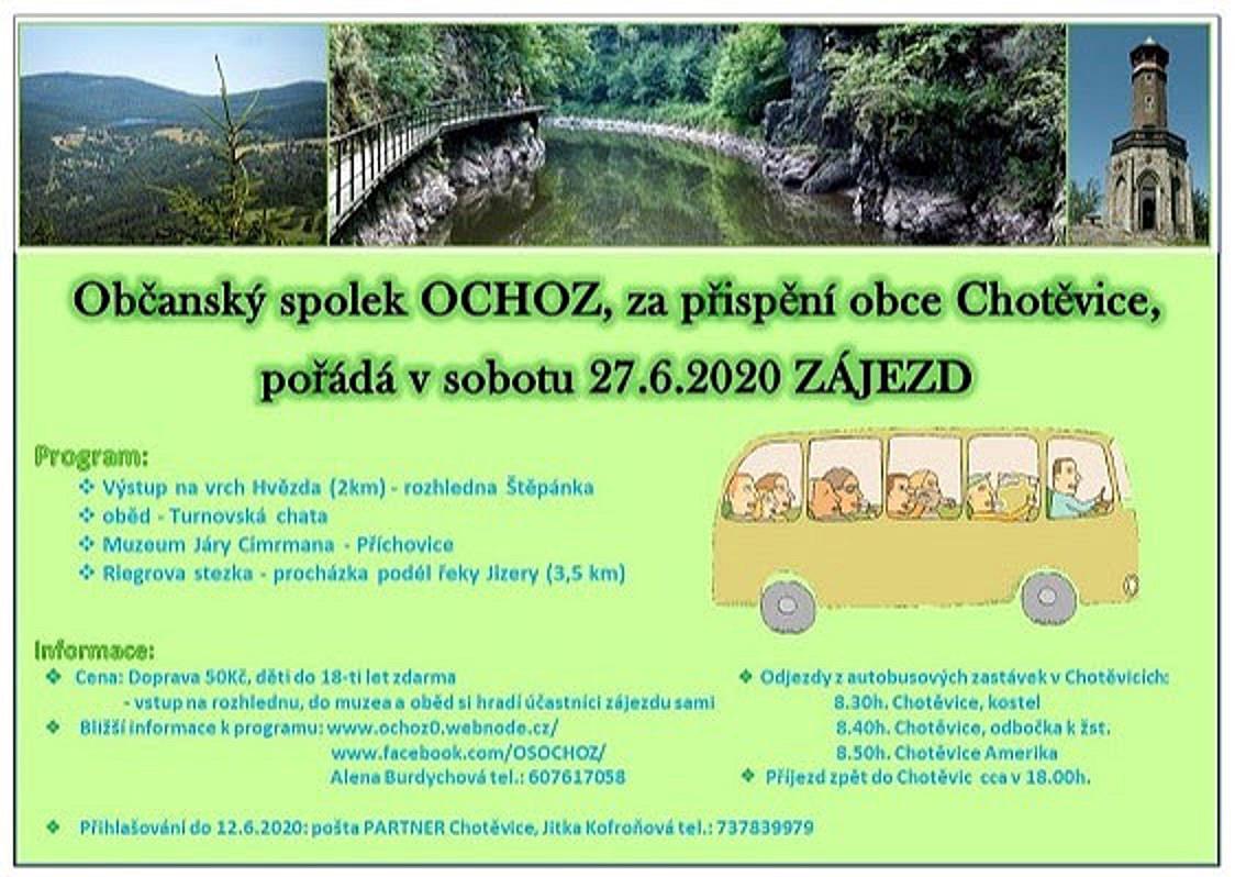 Občanský spolek OCHOZ a obec Chotěvice pořádají v sobotu 27.6.2020 zájezd. Pestrý program s několika zajímavými zastávkami a další informace naleznete na plakátu.