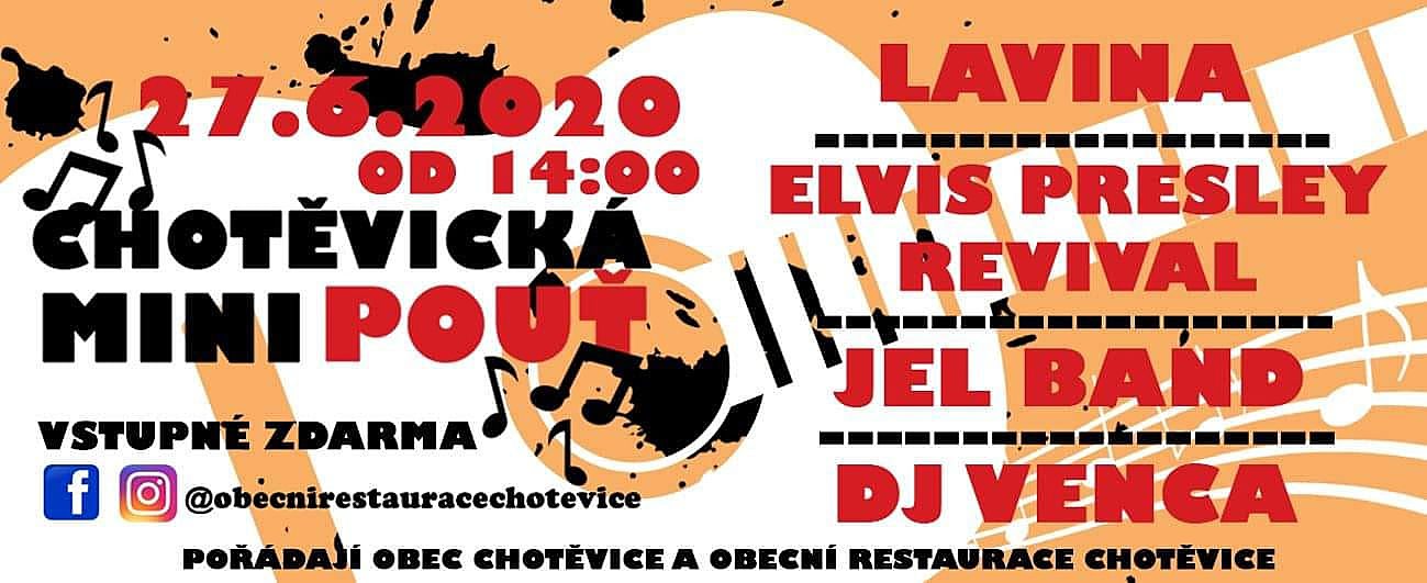 Obec Chotěvice a obecní restaurace Chotěvice pořádají v sobotu 27. 6. 2020 od 14:00 hodin Chotěvickou mini pouť. K tanci i poslechu zahrají kapely Lavina, Elvis Presley revival, Jel Band a DJ Venca. Vstupné zdarma.