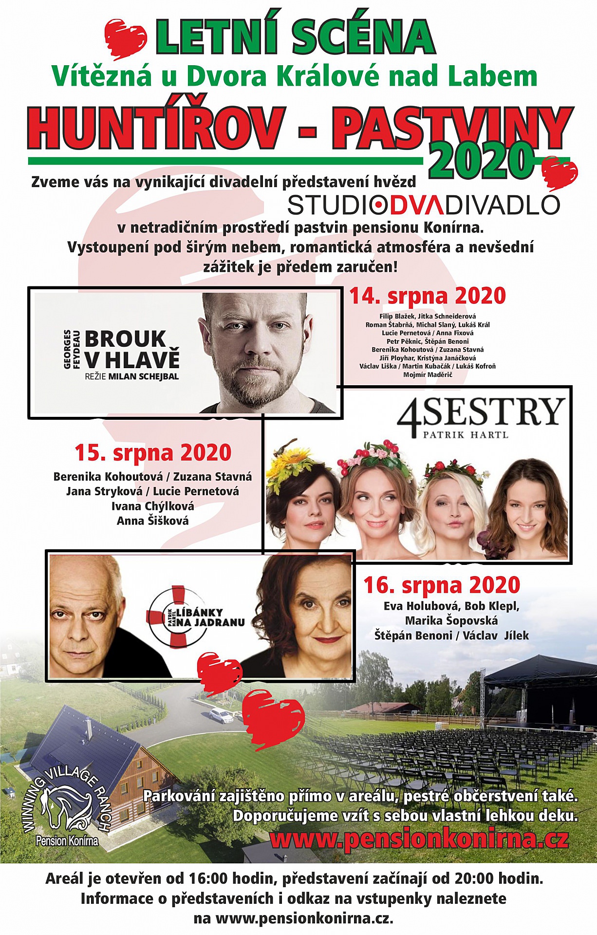 Vystoupení pod širým nebem, romantickou atmosféru i spoustu nevšedních zážitků. To vše slibuje akce s názvem Pastviny 2020, která se ve dnech 14.-16.8. uskuteční ve Vítězné. V netradičním prostředí pastvin pensionu Konírna se o zábavu návštěvníků postarají Ivana Chýlková, Bob Klepl, Berenika Kohoutová, Filip Blažek, Eva Holubová a další herecké osobnosti. Více informací načerpáte na stránkách www.pensionkonirna.cz, prohlédněte si také plakát.
