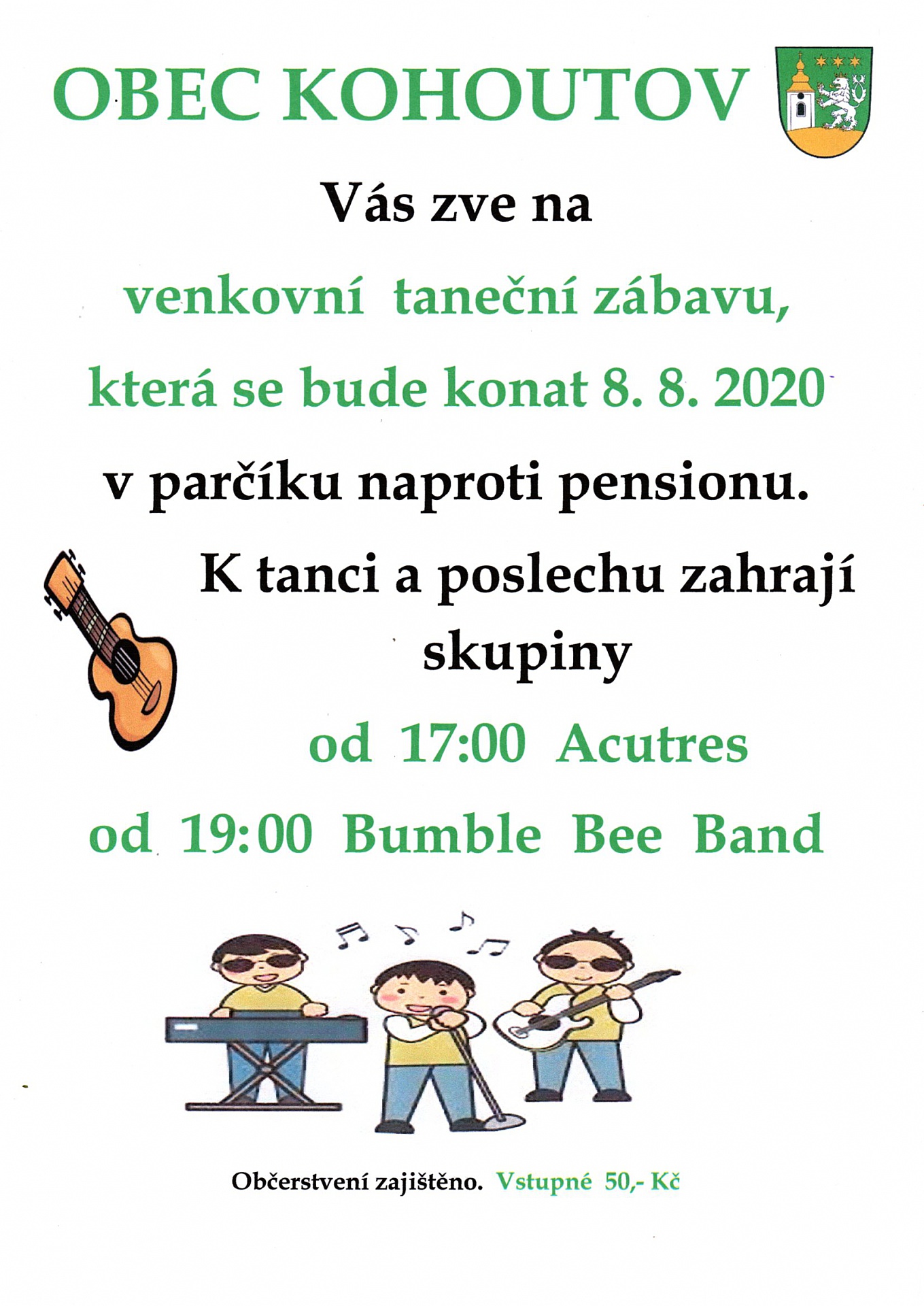 V parčíku naproti pensionu v Kohoutově se představí skupiny Acutres a Bumble Bee Band. Občerstvení zajištěno, vstupné 50,- Kč.