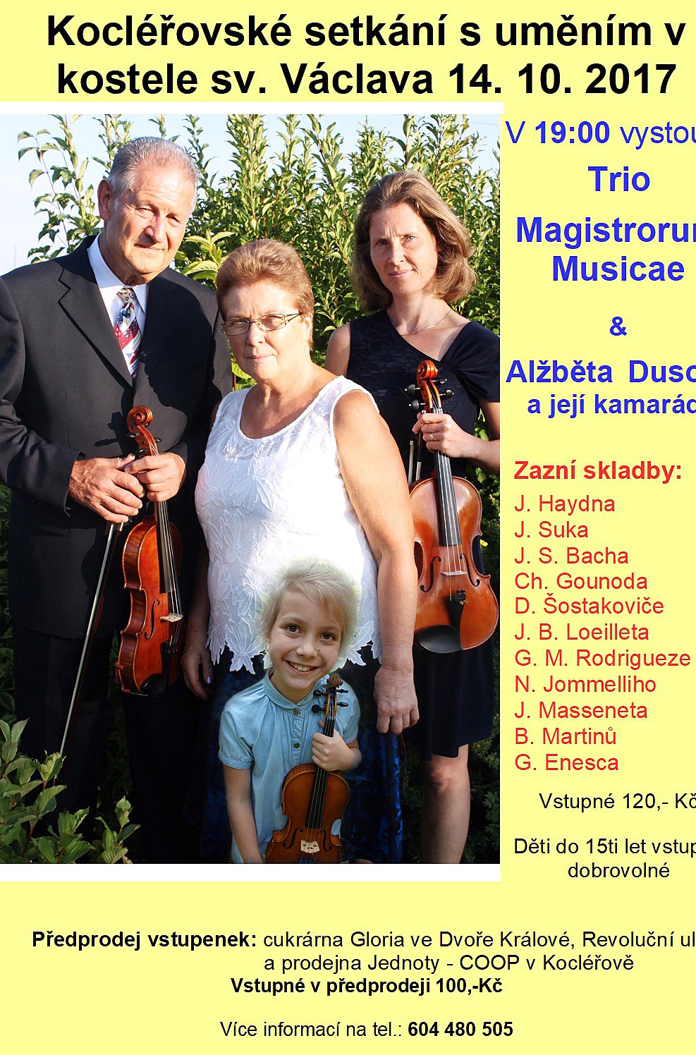 V kostele sv. Václava vystoupí dne 14.10.2017 trio Magistrorum Musicae & Alžběta Dusová a její kamarádi. Koncert začíná v 19 hodin a na programu jsou mezi jinými skladby J. Suka, J. S. Bacha nebo B. Martinů. Koncert pořádá Spolek přátel hudby Kocléřov a Děkanství Dvůr Králové n. L. s podporou obce Vítězná.