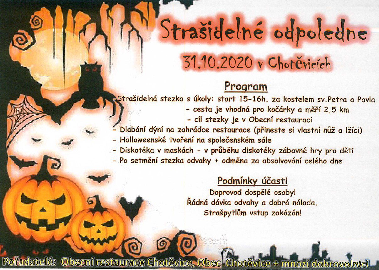 Zábavné a trochu strašidelné odpoledne pro celou rodinu. Přijďte se pobavit poslední říjnovou sobotu k chotěvickému kostelíku, kde bude připravena strašidelná stezka vhodná i pro kočárky. Cíl je v Obecní restauraci. Nutný doprovod dospělé osoby! Řádná dávka odvahy a dobrá nálada.
