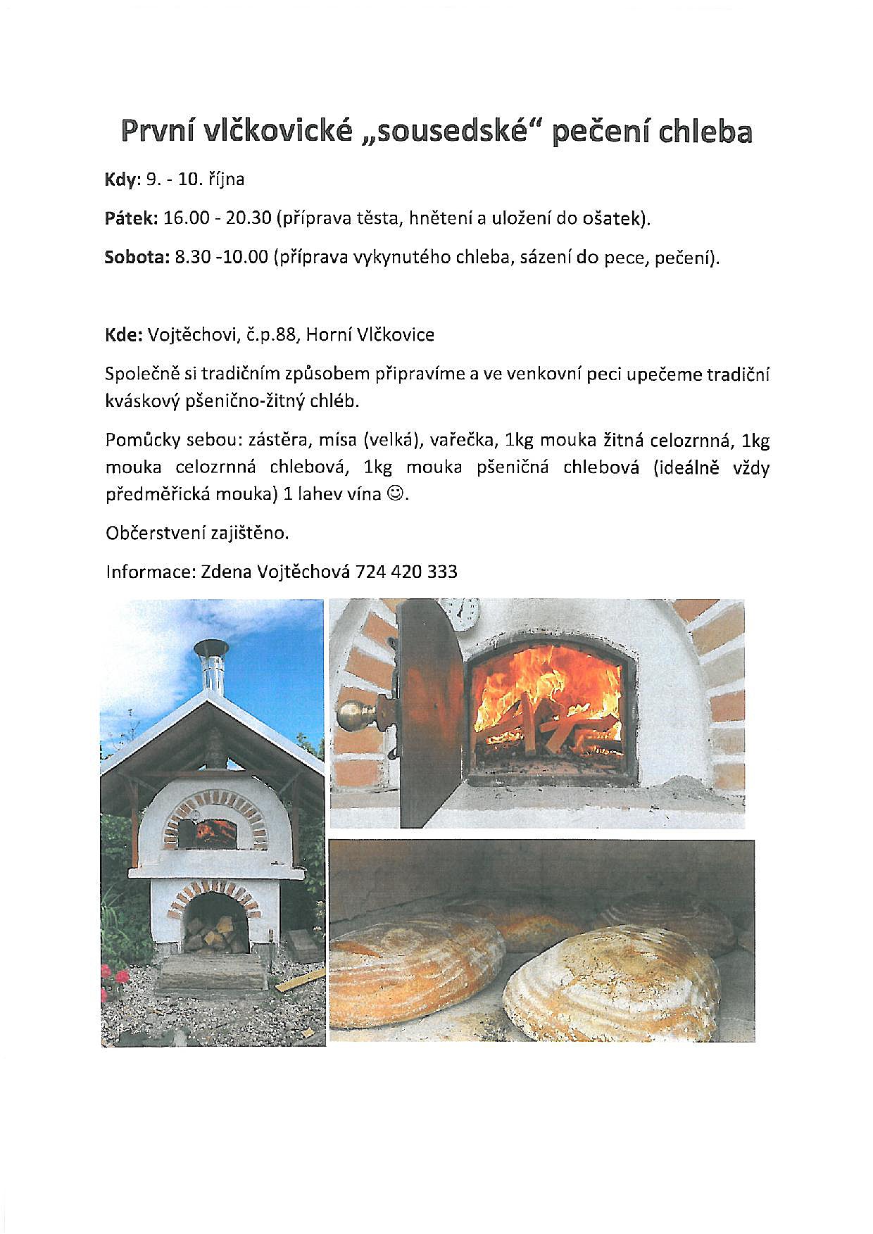 Přijďte si vychutnat báječnou voňavou atmosféru na pečení chleba v peci. Tento pátek a sobotu máte jedinečnou šanci, seznámit se s pečením chleba. Věřte, že takový chleba v supermarketu nepotkáte! Nezapomeňte na láhev vína a dobrou náladu:-). Občerstvení zajištěno. Informace: Zdena Vojtěchová 724 420 333
