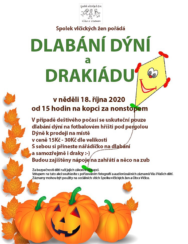 Spolek vlčických žen pro Vás připravil program na nedělní odpoledne. Dýně k prodeji na místě. Nářadíčko k dlabání a draky s sebou, občerstvení zajištěno.