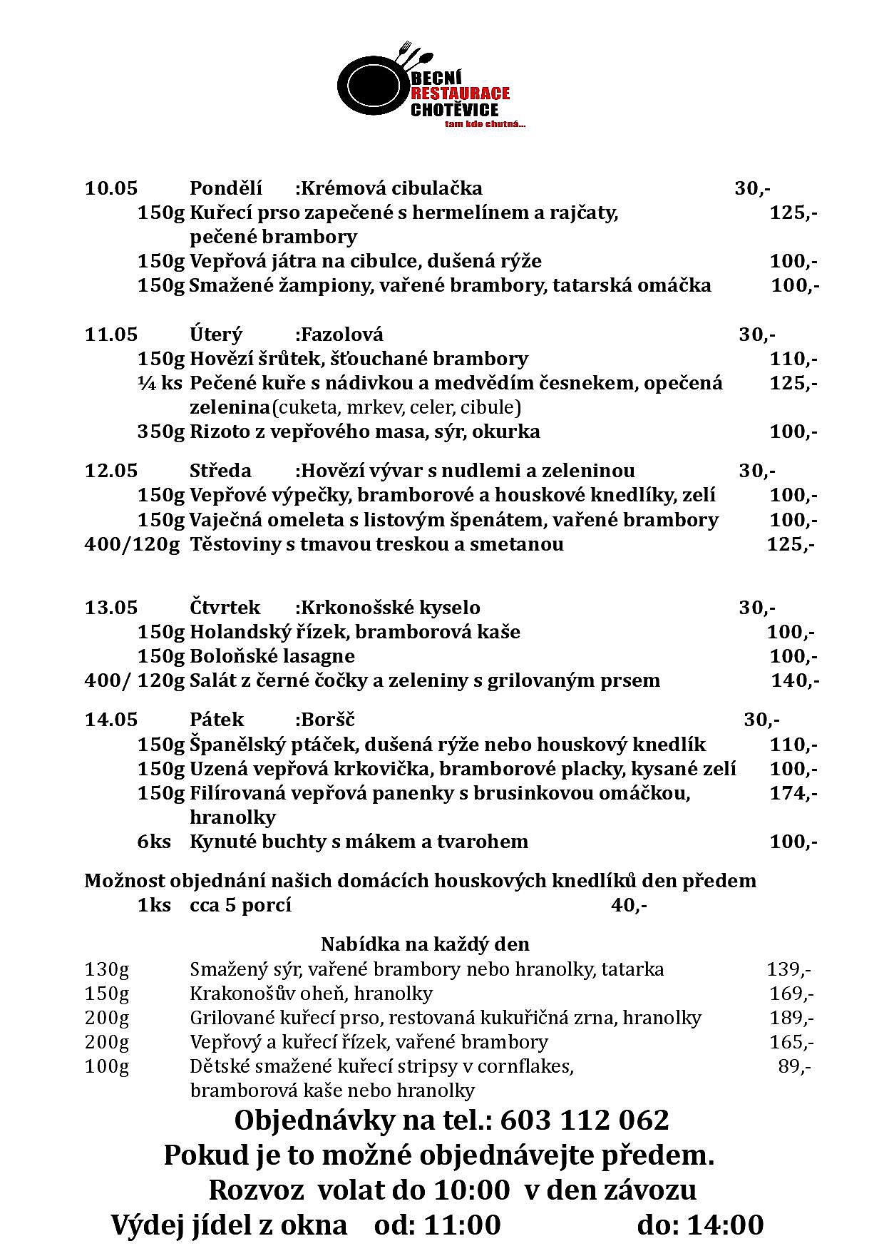 Jídelní lístek Obecní restaurace Chotěvice 10.05.2021 - 14.05.2021