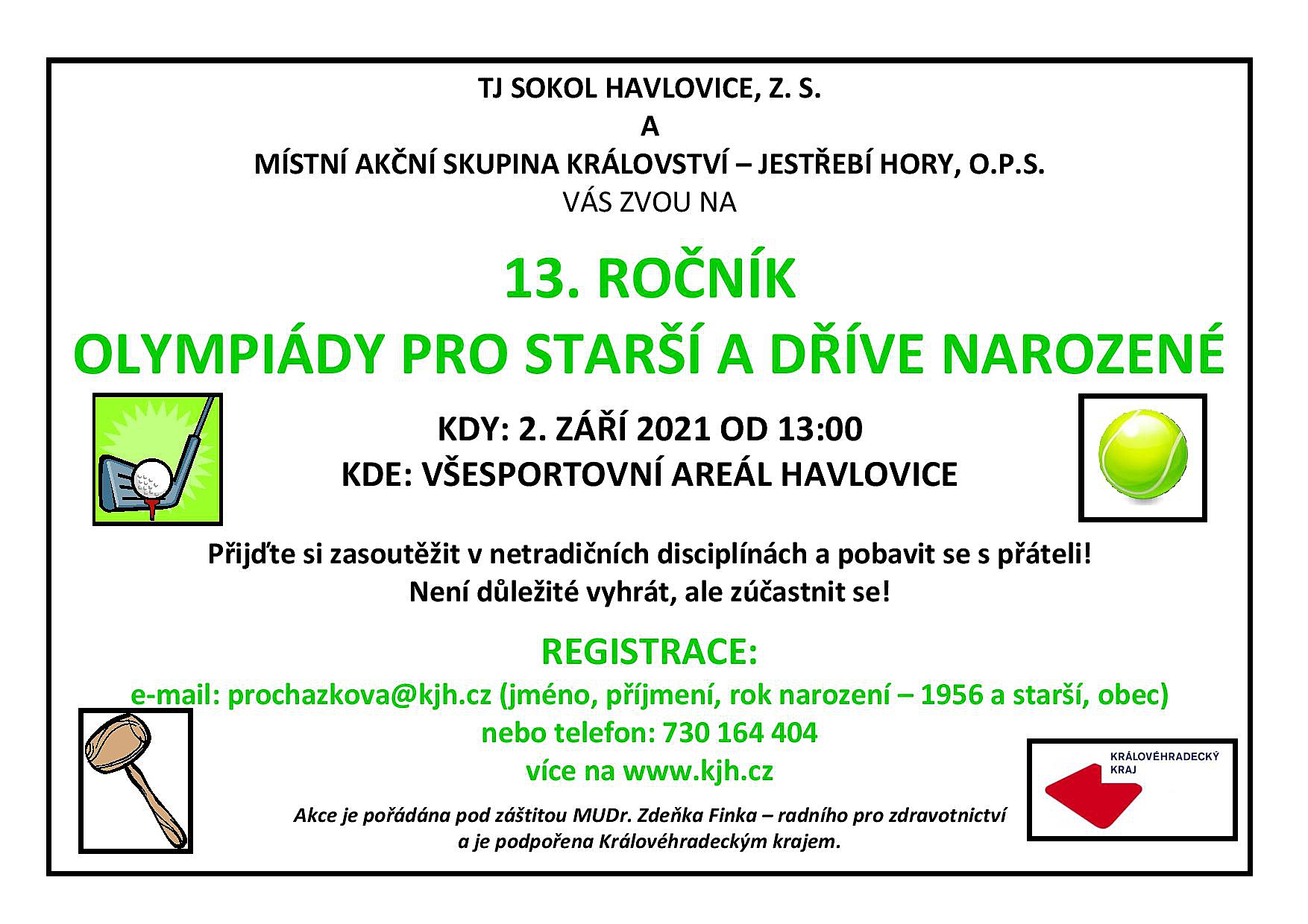 Rádi bychom Vás pozvali na připravovanou akci – Olympiáda pro starší a dříve narozené. Letošní již třináctý ročník se opět bude konat na začátku září v havlovickém Všesportovním areálu. Pro tento rok bylo zvoleno datum 2.září 2021 a začátek akce je stanoven na 13hodin. Vzhledem k zaměření Místní akční skupiny Království – Jestřebí hory, o. p. s. nabízíme zájemcům svoz i odvoz z našeho regionu zdarma. Trasa, časy i místa zastávek budou ještě upřesněny dle přihlášených účastníků. Olympiády se mohou zúčastnit senioři s rokem narození 1956 a starší. V případě zájmu se zaregistrujte na mail prochazkova@kjh.cz (Vaše jméno, příjmení, rok narození a obec) nebo volejte na telefonní číslo: 730 164 404. Včasná registrace zájemců nám pomůže s celou organizací, a proto Vás žádáme o přihlášení nejlépe do 20. 8. 2021. V případě, že se do daného termínu nestihnete přihlásit, přesto Vás v Havlovicích rádi uvítáme a zaregistrujeme až na místě. Více informací najdete ve zvacím dopise a na plakátu.