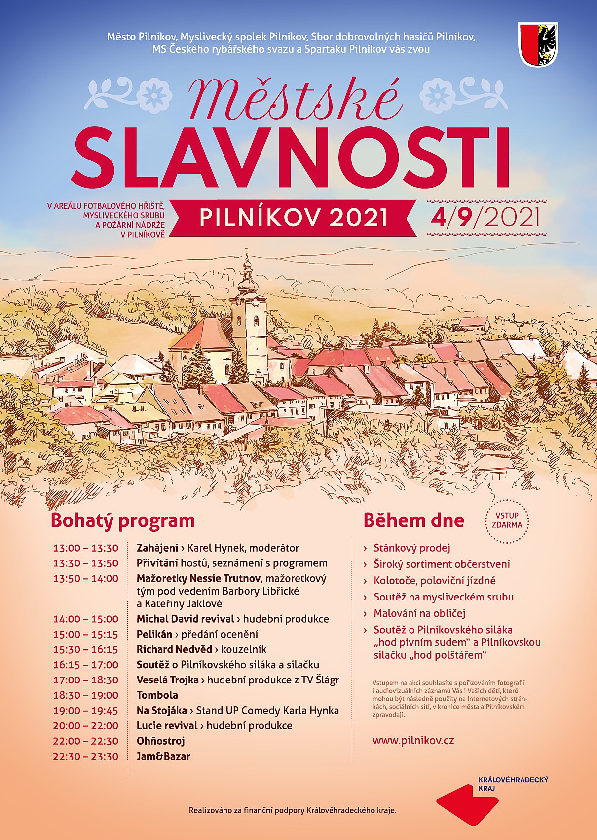 Městské slavnosti v Pilníkově budou mít 4.9.2021 co nabídnout! elké věci se budou dít v areálu fotbalového hřiště, mysliveckého srubu a požární nádrže. Těšit se můžeme na Stand UP Comedy Karla Hynka Na Stojáka, na kouzelníka Richarda Nedvěda, bohatou tombolu nebo ohňostroj.