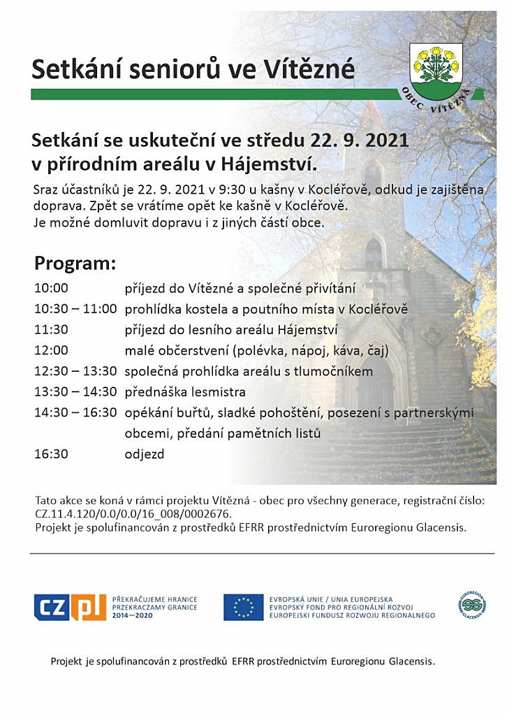 Dovolejeme si Vás pozvat na setkání seniorů, které se uskuteční ve středu 22. 9. 2021 od 9:30h. Sraz je u kašny v Kocléřově, odkud je zajištěna doprava.