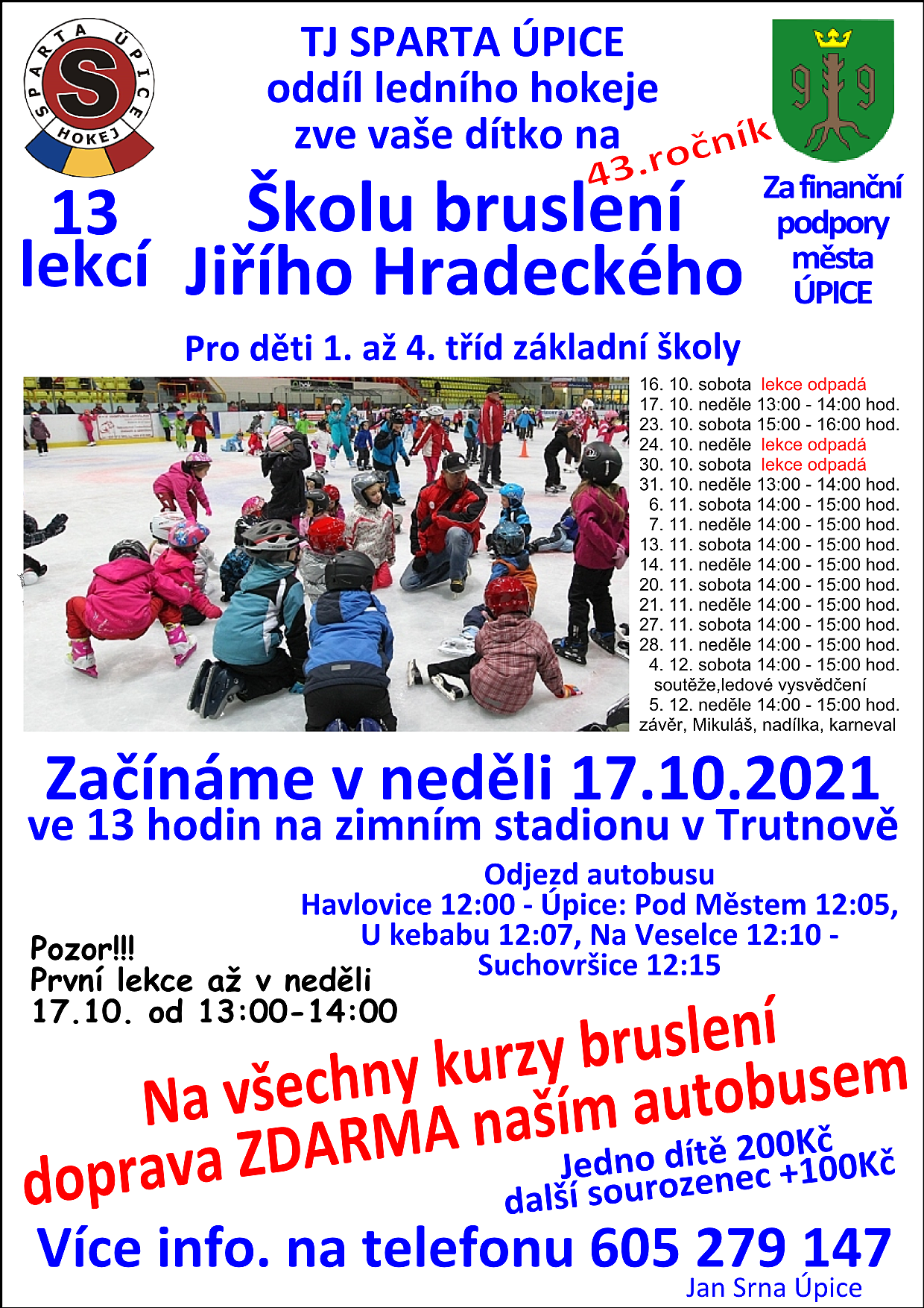 TJ Sparta Úpice, oddíl ledního hokeje zve vaše dítko na Školu bruslení Jiřího Hradeckého. Akce probíhající za finanční podpory města Úpice je určena pro děti 1. až 4. tříd ZŠ. Začíná se v neděli 17.10.2021 ve 13 hodin na zimním stadionu v Trutnově. Na všechny lekce bruslení je doprava oddílovým autobusem zdarma, vyjíždí se ve 12:00 z Havlovic se zastávkami v Úpici a Suchovršicích. Přikládáme i rozpis jednotlivých lekcí.